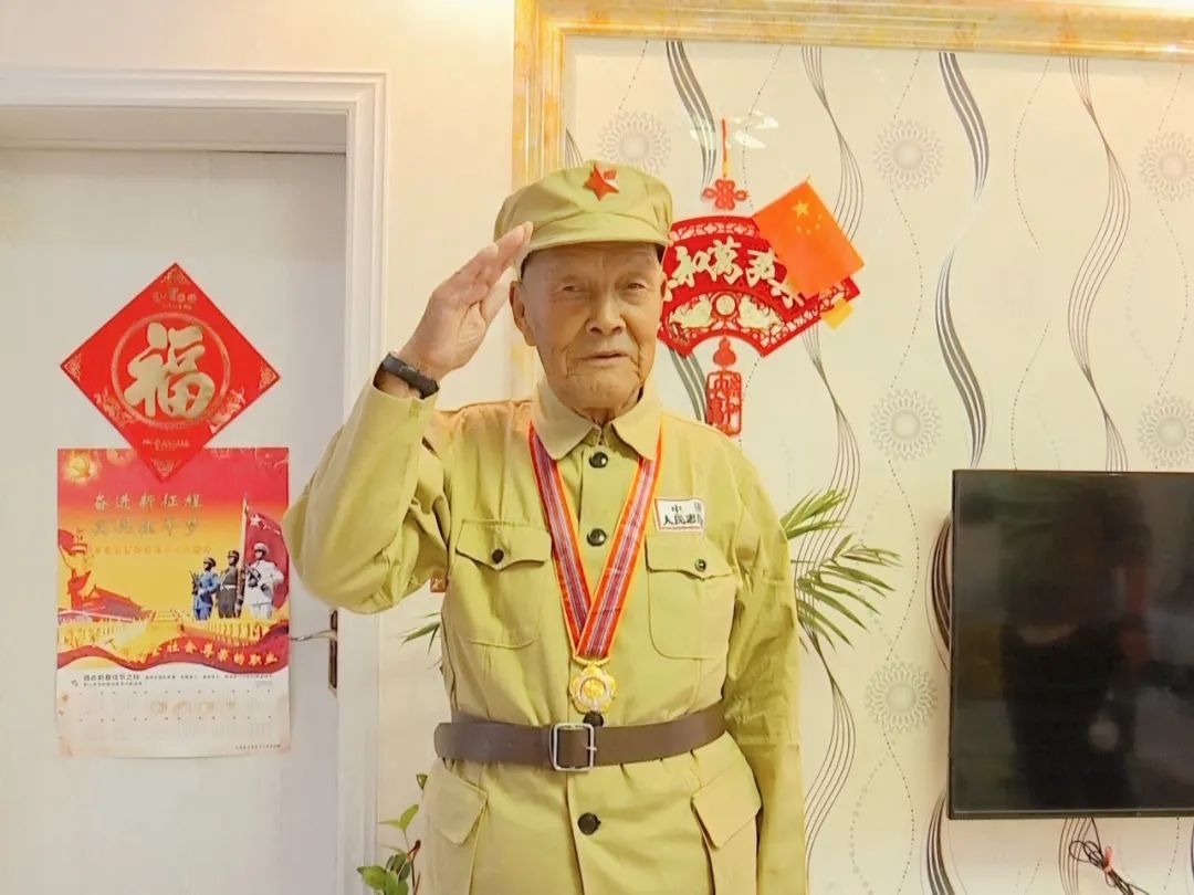 85岁高龄的辛其俊穿上军装后难以抑制激动的心情,他用微微颤抖的声音唱起了《中国人民志愿军战歌》,熟悉的旋律响起,在场的人无不动容。