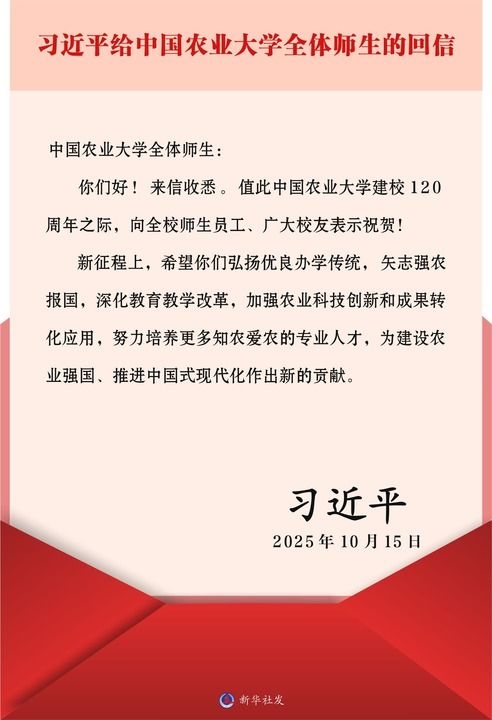 新华社北京10月16日电 近日,中共中央总书记、国家主席、中央军委主席习近平给中国农业大学全体师生回信,在中国农业大学建校120周年之际,向全校师生员工、广大校友表示祝贺。