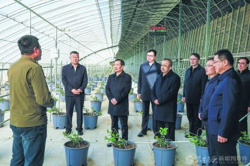 3月24日至25日,自治区党委书记陈小江、自治区主席艾尔肯·吐尼亚孜深入和田地区调研。这是3月25日,陈小江、艾尔肯·吐尼亚孜在墨玉县现代农业产业园,实地了解新疆农牧投集团沙漠生态农业发展情况。□石榴云/新疆日报记者崔志坚摄