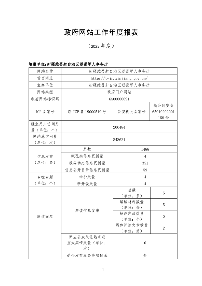 新疆维吾尔自治区退役军人事务厅政府网站工作年度报表(2025年度)